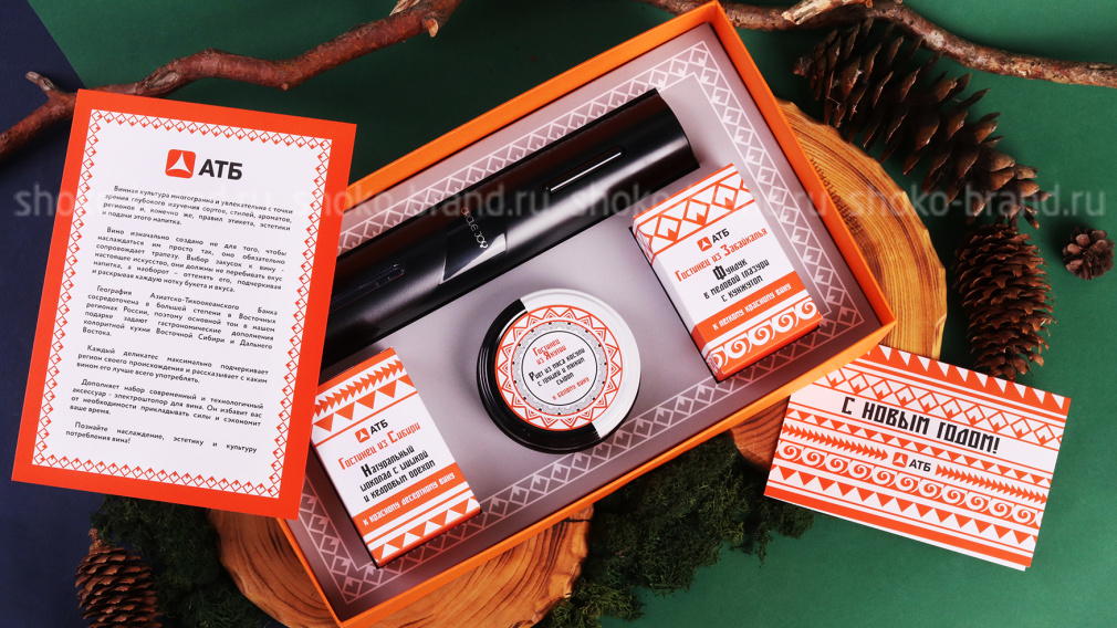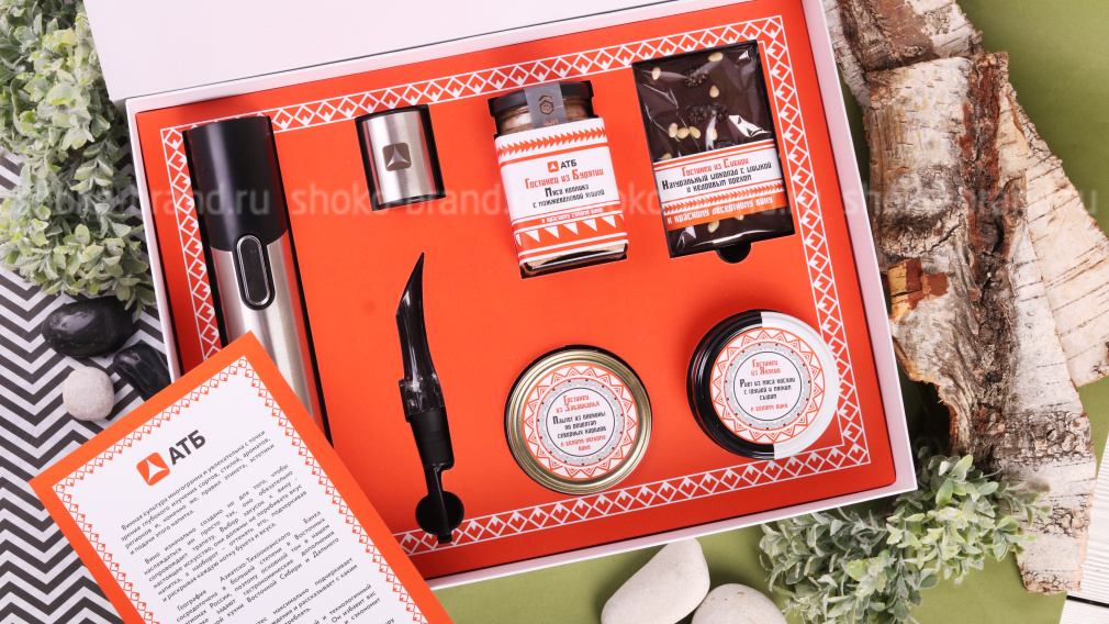 География Азиатско-Тихоокеанского Банка сосредоточена в большей степени в Восточных регионах России, поэтому основной тон подаркам задают гастрономические дополнения к различным видам вина из Якутии, Забайкалья, Красноярского края и Сибири. Каждый деликатес максимально подчеркивает регион своего происхождения и рассказывает с каким вином его лучше всего употреблять.