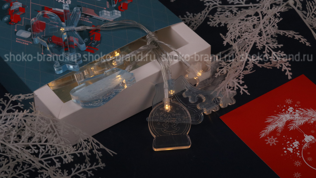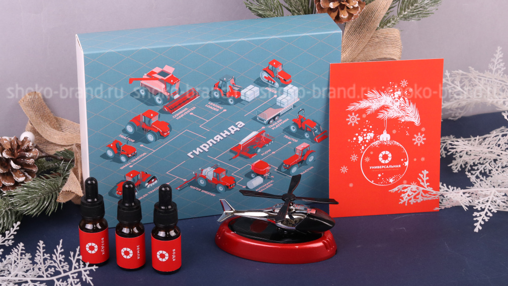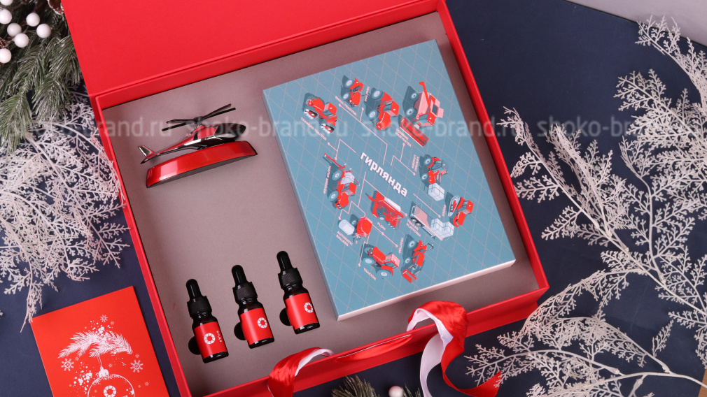 Все виды строительной и коммунальной техники на суше, в море и в воздухе можно найти в этом подарочном наборе!Диффузор в виде вертолета, елочная гирлянда с предметами лизинга, такими как техника, здания и корабли в сочетании с традиционными праздничными фигурками передают представление о широких возможностях компании, не забывая при этом и о новогоднем настроении.