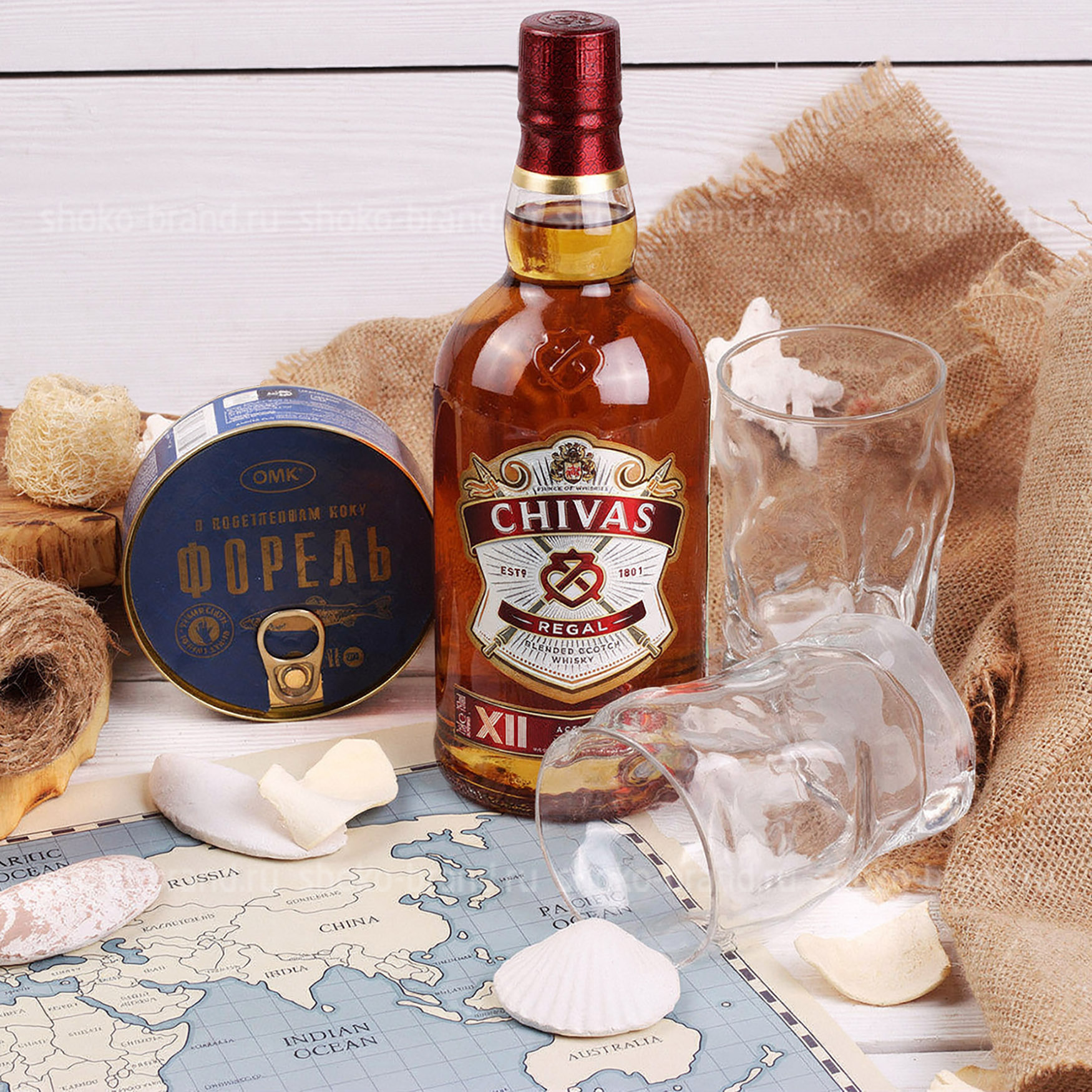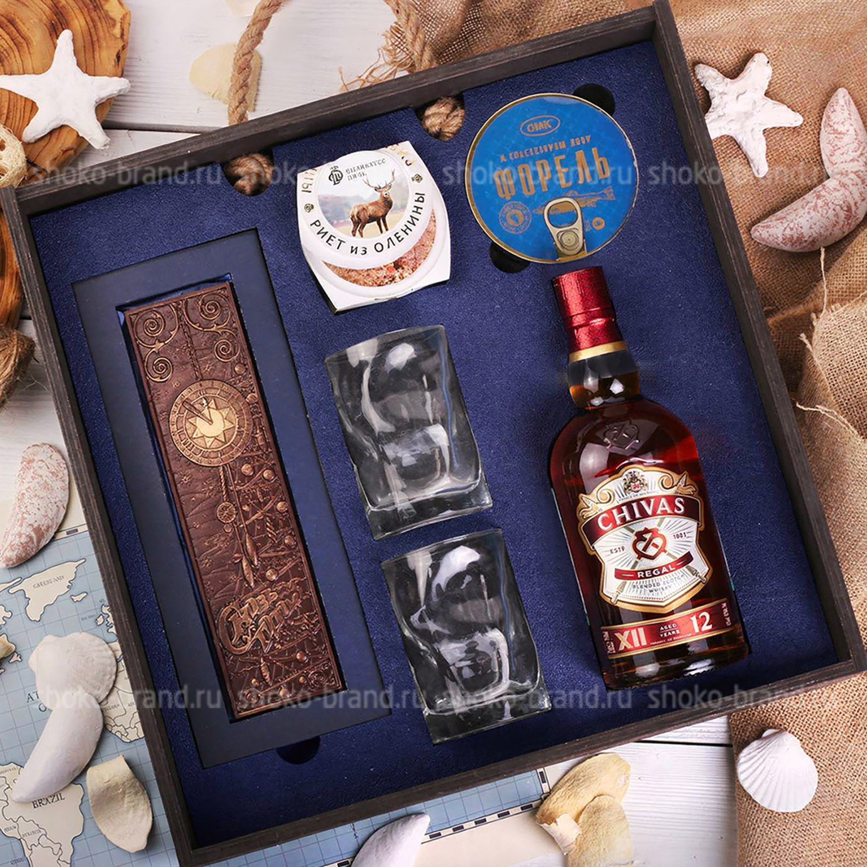 В подарочный набор Богатый улов входит только самое лучшее: виски Глен Морей Сингл Молт Элгин Классик Питед с дизайнерскими бокалами, изысканный бельгийский шоколад ручной работы и деликатес из форели. -