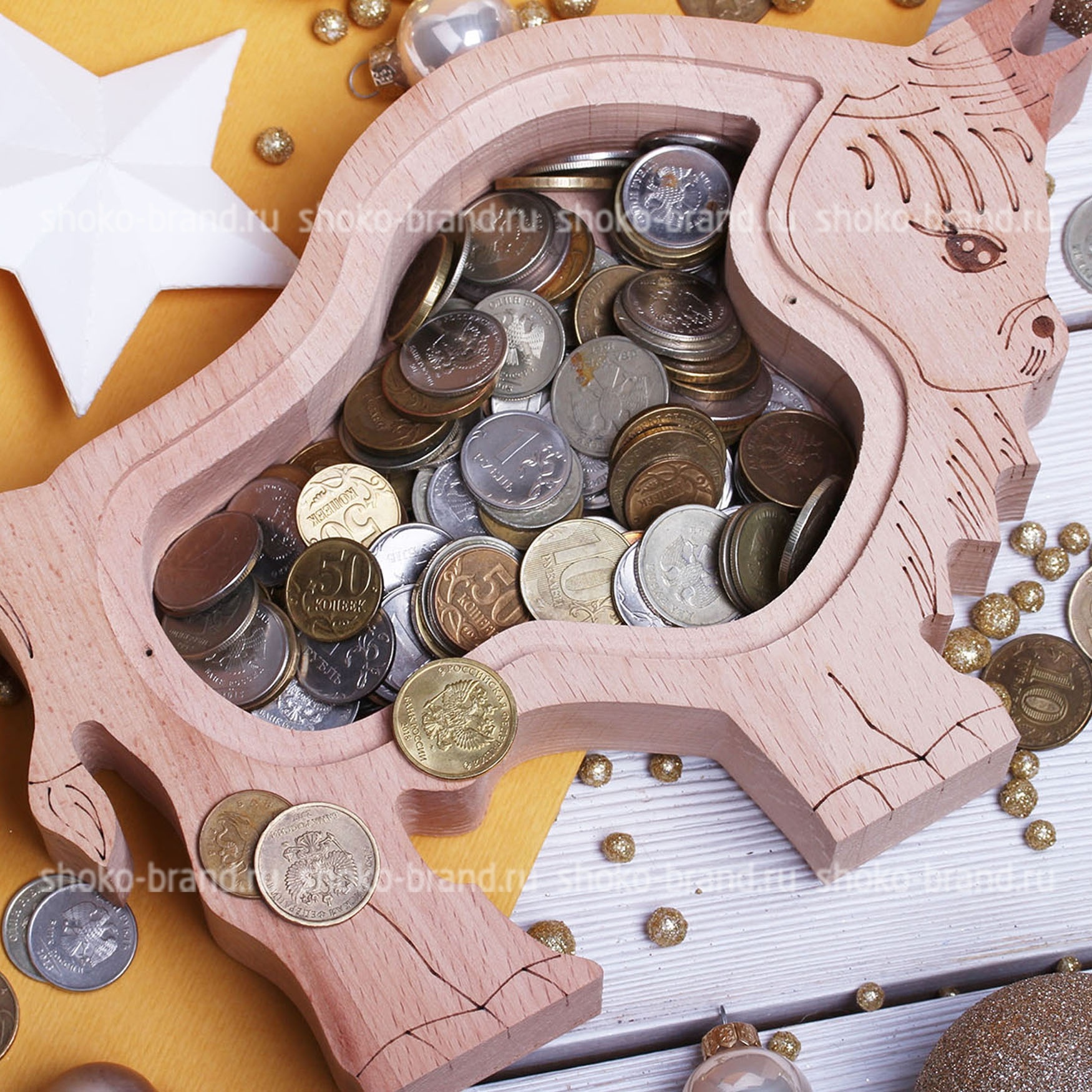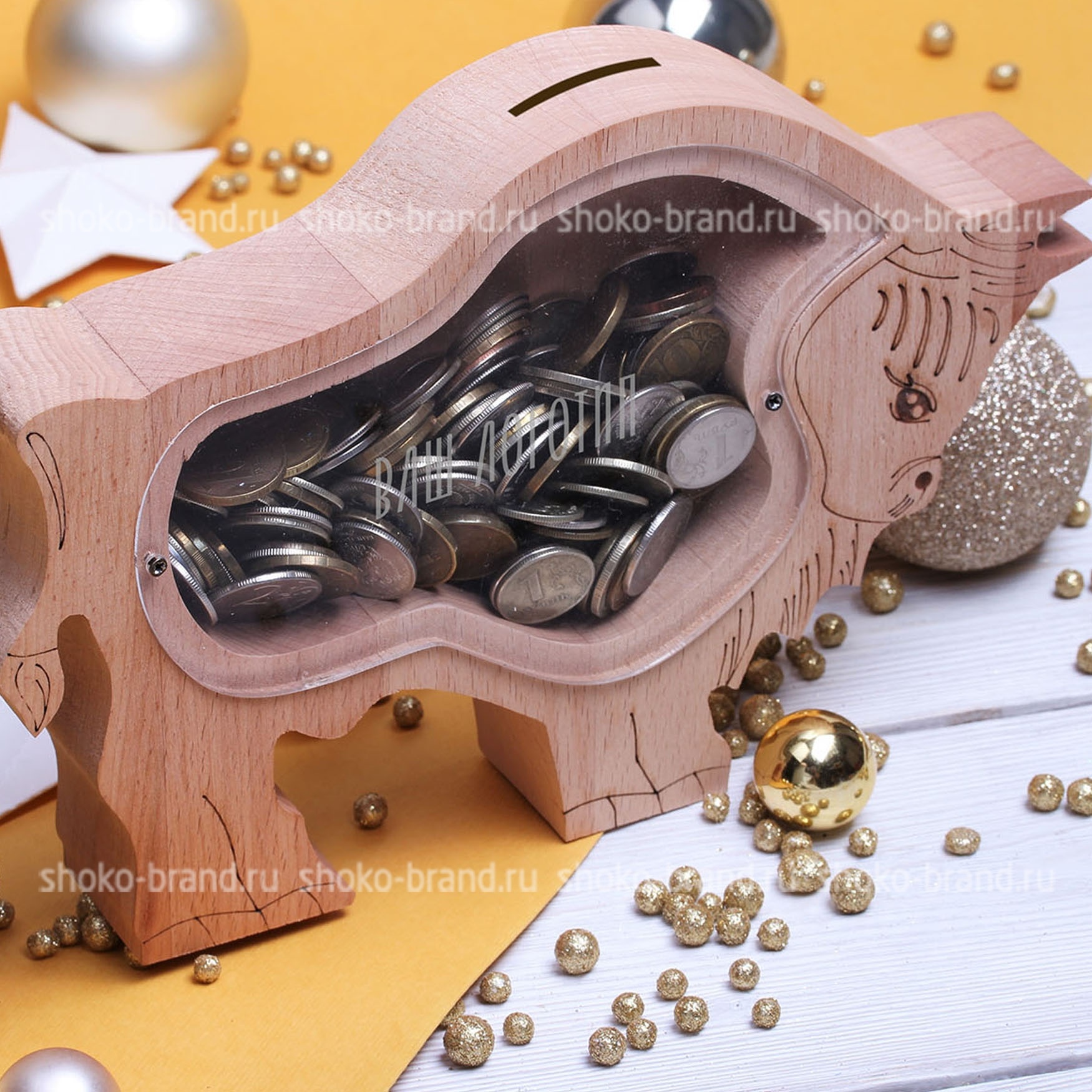 Состав - Деревянная копилка "Бычок" со вставкой из оргстекла