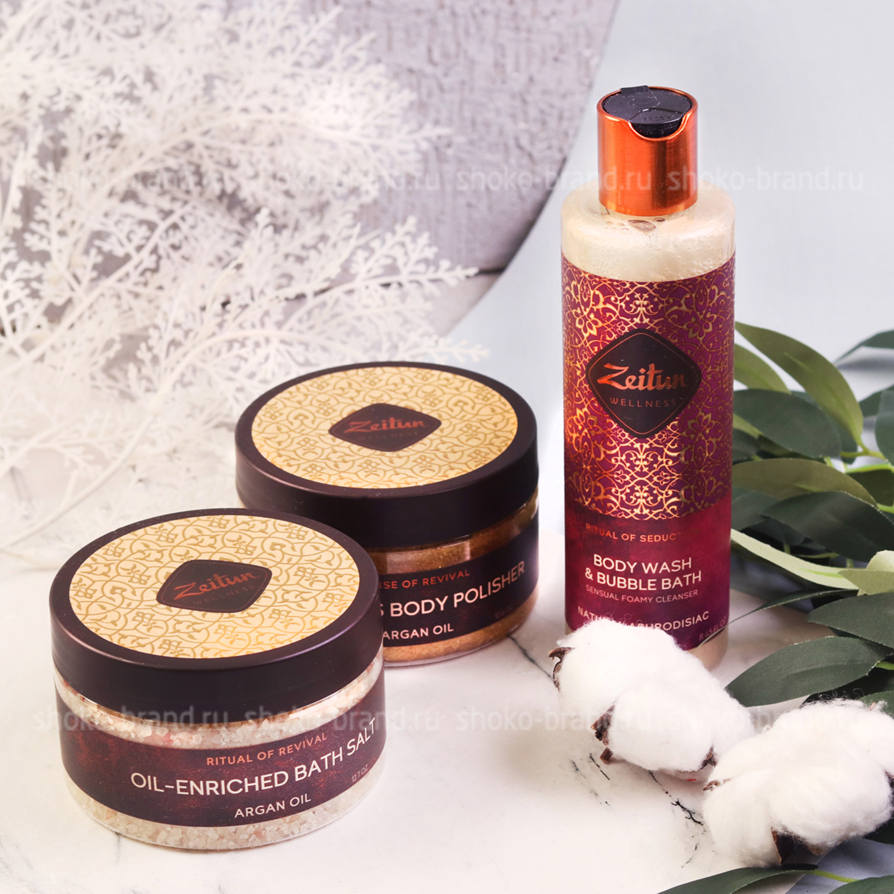 - Лимитированный подарочный набор "SPA-ритуал соблазна" с натуральными афродизиаками: гель для душа, скраб, крем для тела и соль для ванн