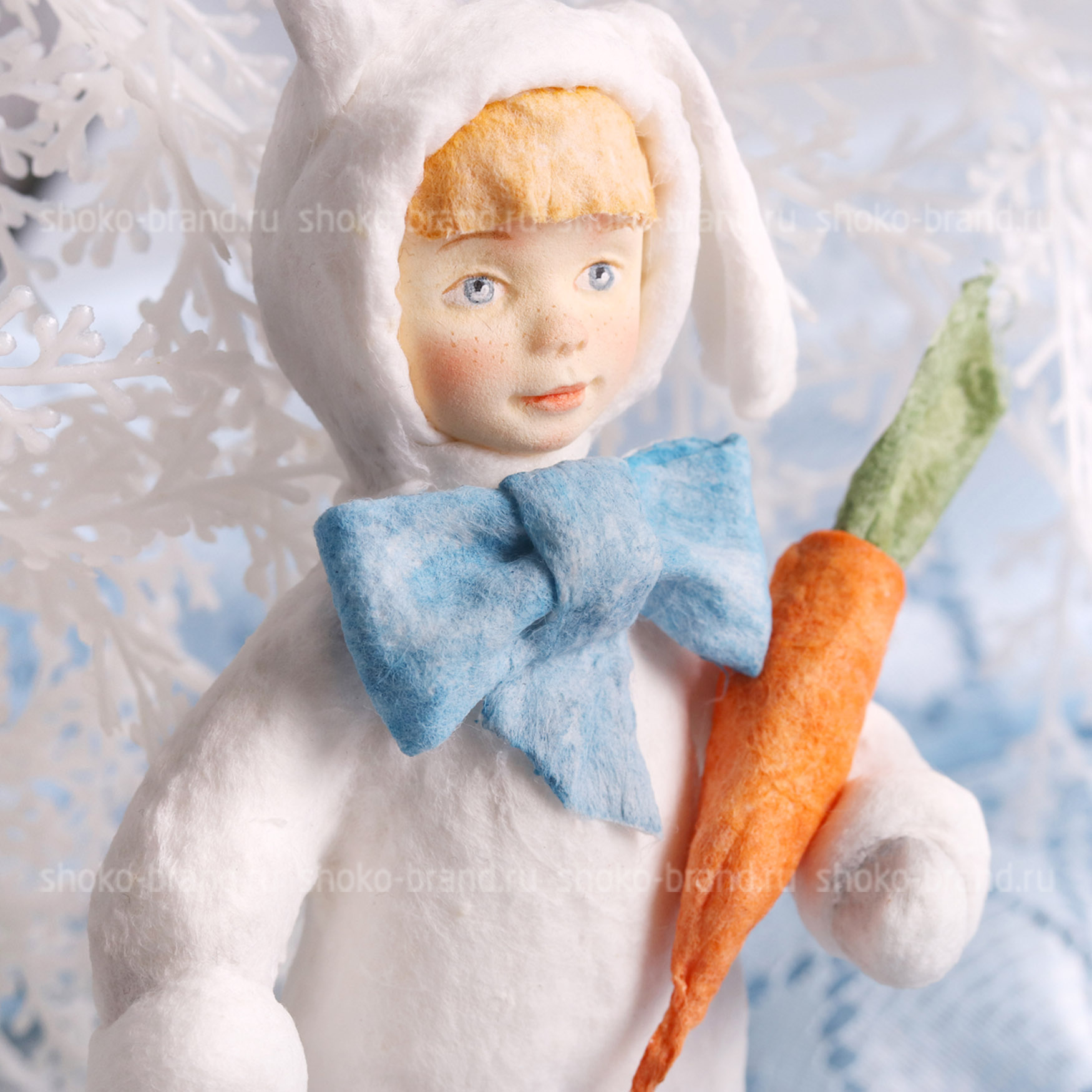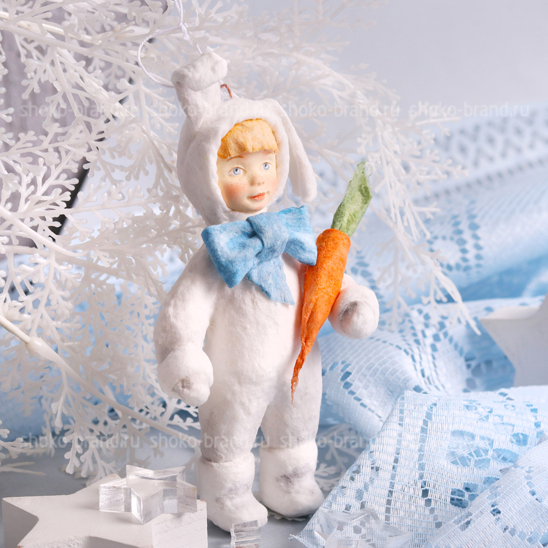 - Авторская елочная игрушка, выполненная в старинной технике Папье-маше, ручная работа Мальчик - зайчонок с морковкой
