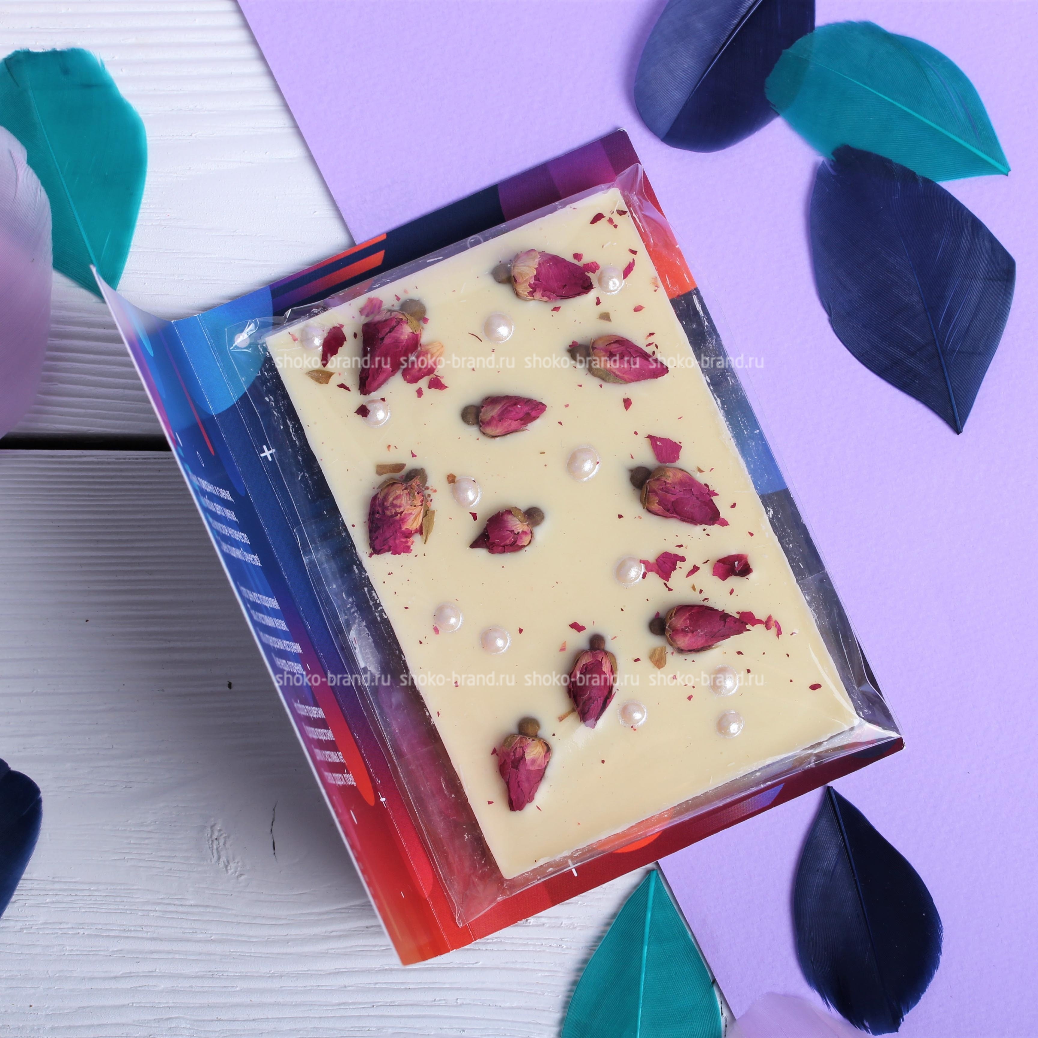 - Розовый шоколад с клубникой, апельсином, фисташкой и лепестками роз