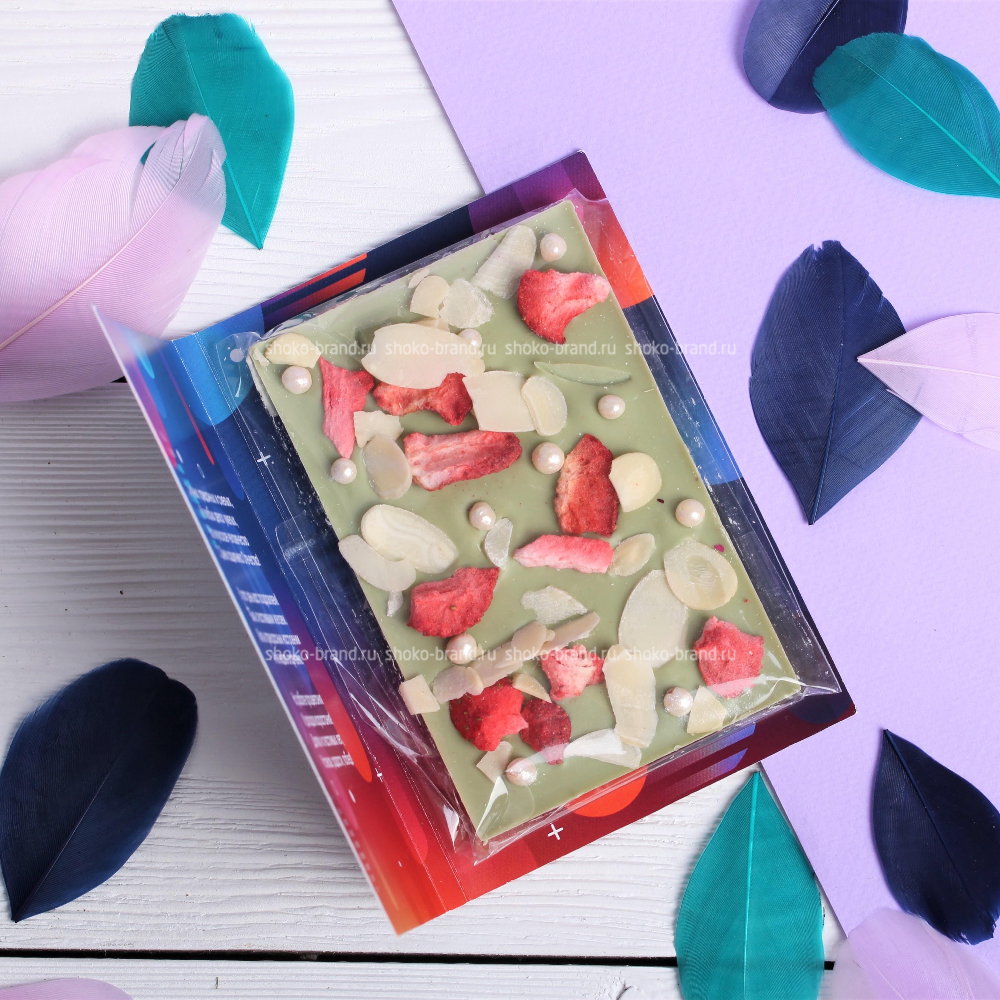 - Фисташковый шоколад с клубникой, лепестками миндаля и криспи