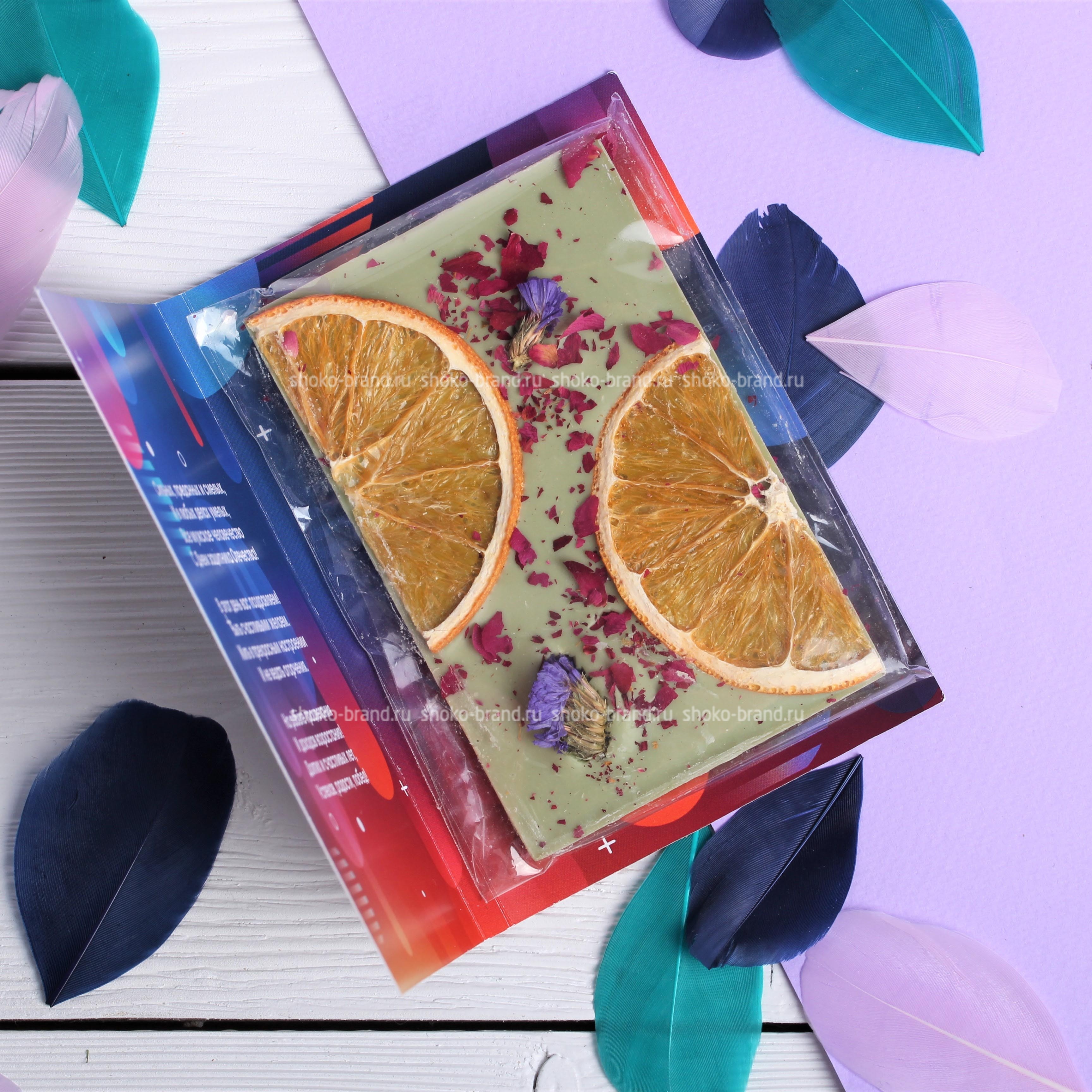 - Фисташковый шоколад с ягодой годжи и каплями апельсинового шоколада