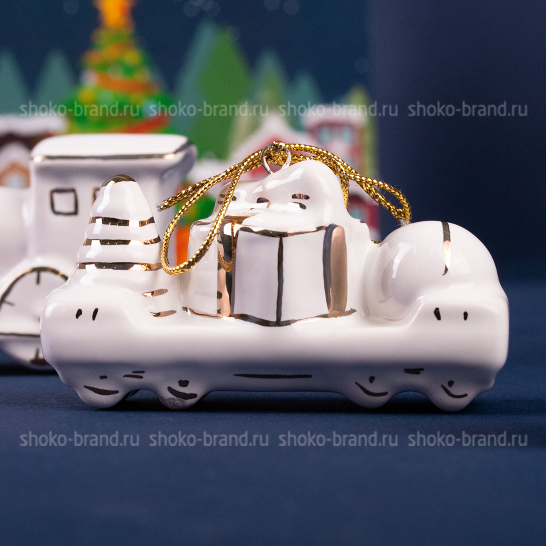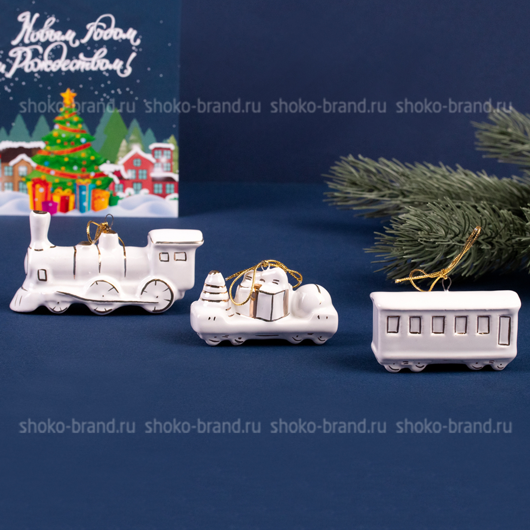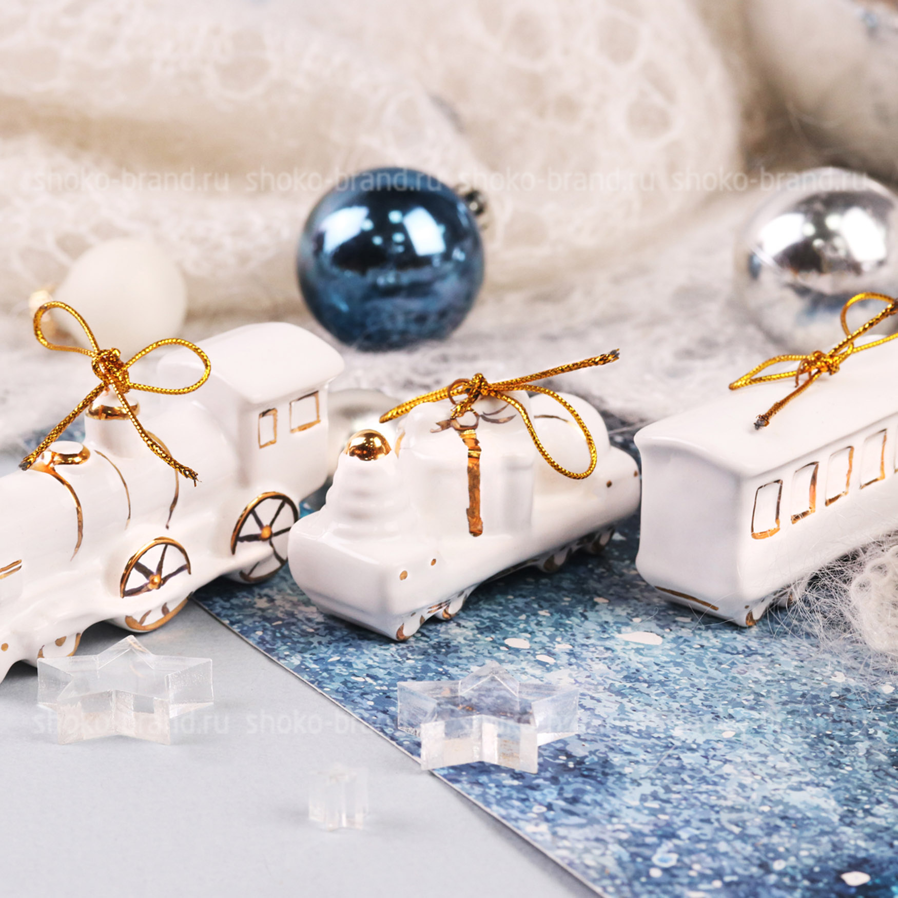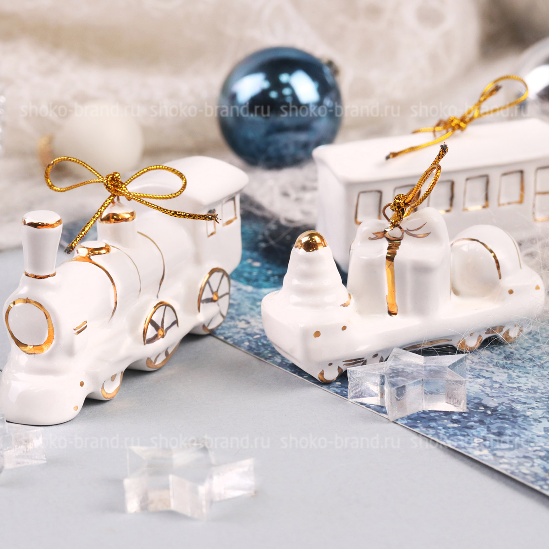 - Игрушка елочная фарфоровая серия Новогодний поезд, ручная роспись 3 шт: