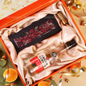 На атласной подложке деревянного сундука ручной работы лежит ароматный ликер и особый шоколад. Приятным дополнением к набору стал золотой джиггер.